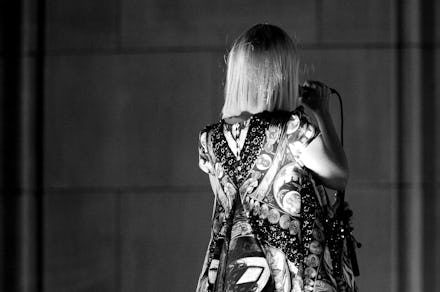 For years, though, she's been studying other peoples' stardom. Her album is called 1000 Forms of Fear, and if you look through her back catalogue, you'll find 1,000 forms of Sia. As an incredibly talented songwriter, she has proven over and over again that she can become the pop stars she writes for — in fact, on Rihanna's "Diamonds," Rihanna liked Sia's demo recording so much that she worked hard to sing it exactly like the writer. Sia has always been a master of throwing her voice.