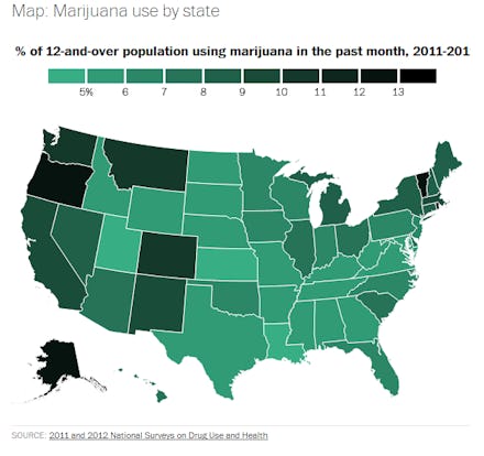 The news: People smoke from coast to coast and the world over, but certain states love the chronic a little more than others. This map from the Washington Post's Christopher Ingraham shows you exactly where the densest clouds of pot smoke are forming across the U.S.: