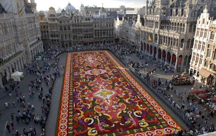 The living carpet, which measures 82 feet wide and 250 feet long and covers nearly 20,000 square feet, was planted earlier this week in Brussels by a team of 120 workers. Its 750,000 begonias, to represent Belgium, are assembled in patterns modeled after traditional Turkish tapestries.