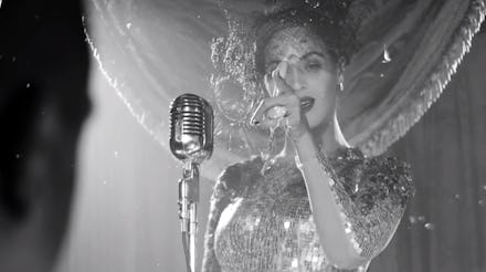 The latest trailer profits, intentionally or not, on the rumored turbulence in the stars' marriage. Beyoncé channels early '60s decadence with a sequined cocktail dress and a sultry cover of Nancy Sinatra's "Bang Bang." Jay Z, ever the boss, looks on from the crowd as she looks straight at him and sings,"Bang bang, he shot me down." She raises her hand and mimes shooting him. Everybody in America will be watching this film.