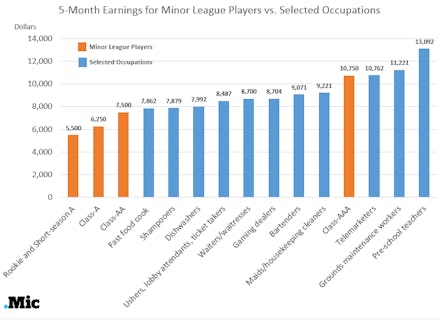 That's the federal minimum wage, yet that's actually relatively good pay for a minor leaguer. Men playing Class-A ($1,250/month) are looking at $6/hour compensation, while Rookie and short-season-A players ($1,100/month) are earning even less than that.