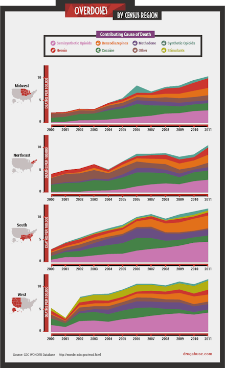 In an overall summary of overdose deaths in the US between 1999 and 2011, we see the drastic increase in chemical addiction that is plaguing the country. This is what a massive increase in overdose deaths looks like.