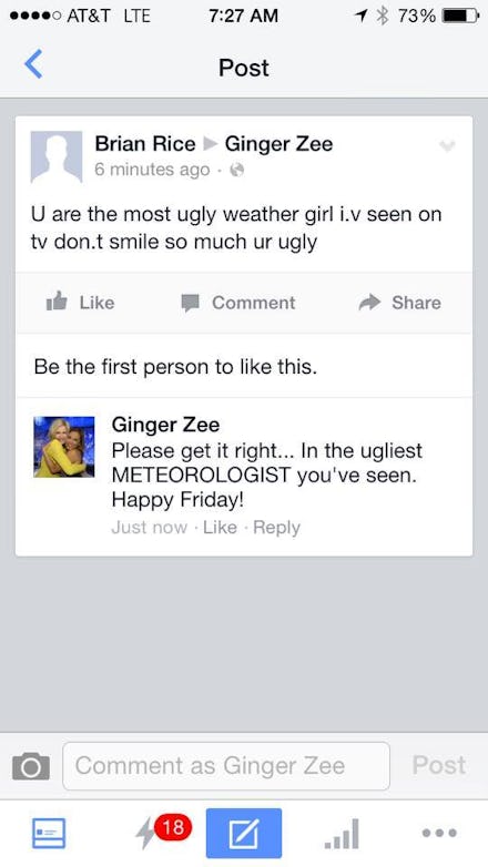 The man, Brian Rice, had mistakenly called her a "weather girl," a term ostensibly referring to some of the first female scientists who succeeded in pushing past decades of sexism to earn a place in one of the most sacred spaces across America — nightly television. But Ginger Zee, who works for ABC News, is no weather girl, as she was quick to point out her Facebook response to Rice.