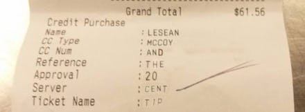 So what’s the takeaway here: That it’s sad McCoy’s 20-cent tip is getting more attention than the time he told his Twitter followers to harass the mother of his child, or the lawsuit that says he and his bodyguard threw a woman off a bus? That you should tip well if you’re famous, lest the restaurant post a receipt to Twitter? That, while it must be cathartic, restaurants would be better served not posting low-tip receipts to their Facebook pages? That it’s actually a 0.3% tip and not a 0.03% tip like PYT wrote? Sure. All of these. Valuable lessons.