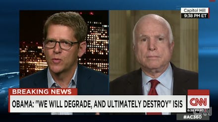 McCain was really on the offense during the segment, insisting to Carney that Obama had turned his back on the moderate Syrian opposition while letting IS spread unchecked throughout Iraq. "Facts are stubborn things, Mr. Carney," the senator said, "and that is, his entire national security team, including his secretary of state, said 'We want to arm, train and equip these people,' and he made the unilateral decision to turn them down. And the fact that he didn't leave a residual force in Iraq, overruling all of his military advisers, is the reason why we're facing ISIS today." McCain continued on to say he had personally met members of the Syrian opposition and said they needed weaponry.