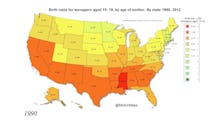 This new animation, created by @MetricMaps, a Twitter and Reddit account that specializes in "visualizing behavioral health data," tracks the decline of birth rates for teenagers aged 15-19 by state from 1990 to 2012. Take a look: