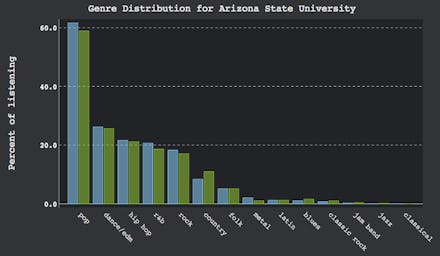 Different strokes for different folks: More interestingly, Spotify also analyzed what kind of music students at each university were listening to, and when. For instance, students at Arizona State — which listened to the most music on Spotify — are most likely to use the service around 4 p.m. and enjoy trendy pop artists such as Lorde, Calvin Harris and Ariana Grande: