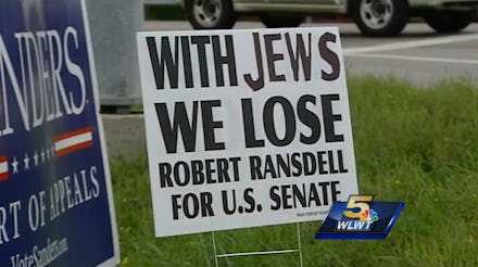 A high school student snapped a picture of the "With Jews We Lose" sign after the event. Ransdell's campaign has put up a few dozen in northern Kentucky, according to WLWT, where they've caused a stir among drivers and passersby.