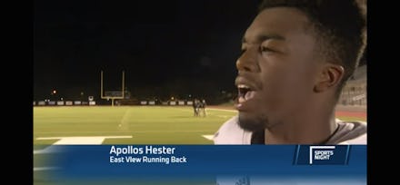 Apollos Hester is a wide receiver for the East View Patriots in Georgetown, Texas. Following his team's 42-41 come-from-behind win over Vandergrift High School, Hester turned the postgame interview — a traditionally dull, cliche-ridden affair — into a two-minute motivational sermon that's certain to go down in all-time Internet lore.