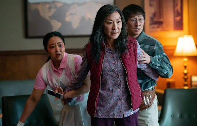 Beloved movie house A24 has released the tailer for what is sure to be its next big hit, Everything Everywhere All At Once. The film centers “an exhausted Chinese American woman (Michelle Yeoh) who can't seem to finish her taxes.” But the trailer quickly reveals, as Yeoh goes back and forth with a quippy bureaucrat (Jamie Lee Curtis) who might be possessed (aren’t they all), the film is going to focus on far more than just the existential ennui of living under capitalism. As a googly-eyed logo pops up and a staccato score starts to pulse, things start to unravel — literally, as in the fabric of reality — and Yeoh becomes an unlikely heroine.