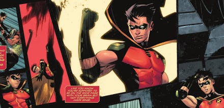 Here's how the meet-cute goes down: Batman's sidekick saves his friend Bernard from a mysterious villain and the two share an unexpected moment of connection. Later, out of costume as Tim Drake, he gets asked out to dinner by the same guy (who doesn't know his friend and Robin are one-and-the-same). Tim happily accepts: "Yeah ... yeah, I think I want that," he tells Bernard, beaming.