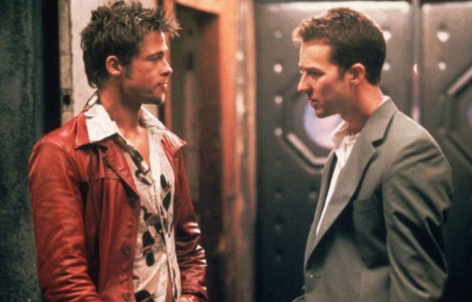 In the actual ending of Fight Club, the unnamed protagonist (Edward Norton) kills Tyler Durden — who is revealed to be a projection of the protagonist’s own dissociated identity — only to witness the success of his anarchic plan of blowing up the high-rises around them to wipe out everyone’s debts.