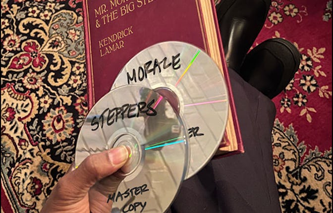 The rapper had previously announced in April that his new album would be titled Mr. Morale & The Big Steppers, but this is the first indication that it could be split up into two parts. In the photo, Lamar is holding two discs: one with a Sharpied-note with the label “Morale,” and another with the label “Steppers.” Behind the discs, he is holding a red book with the album’s title and his name.