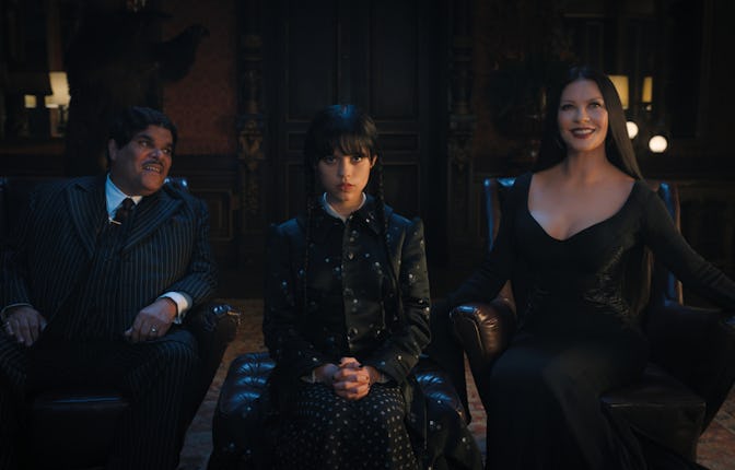 The show also features Catherine Zeta-Jones as Morticia, Luis Guzmán as Gomez, and Isaac Ordonez as Pugsley. Alfred Gough, who co-created the series with Miles Millar, told Vanity Fair, “The relationship that kind of hangs over the season is really Wednesday’s relationship with Morticia. How do you step out of the shadow of a mother as glamorous as Morticia?” Gough also gave Wednesday’s peculiarities a backstory, in that she loathes her parents' gooey love for one another that has trademarked all Addams Family iterations. He added, “Wednesday is not scared of sharks or creepy crawlies or anything, but she’s afraid of emotion. Their overt displays of affection drive Wednesday crazy.”