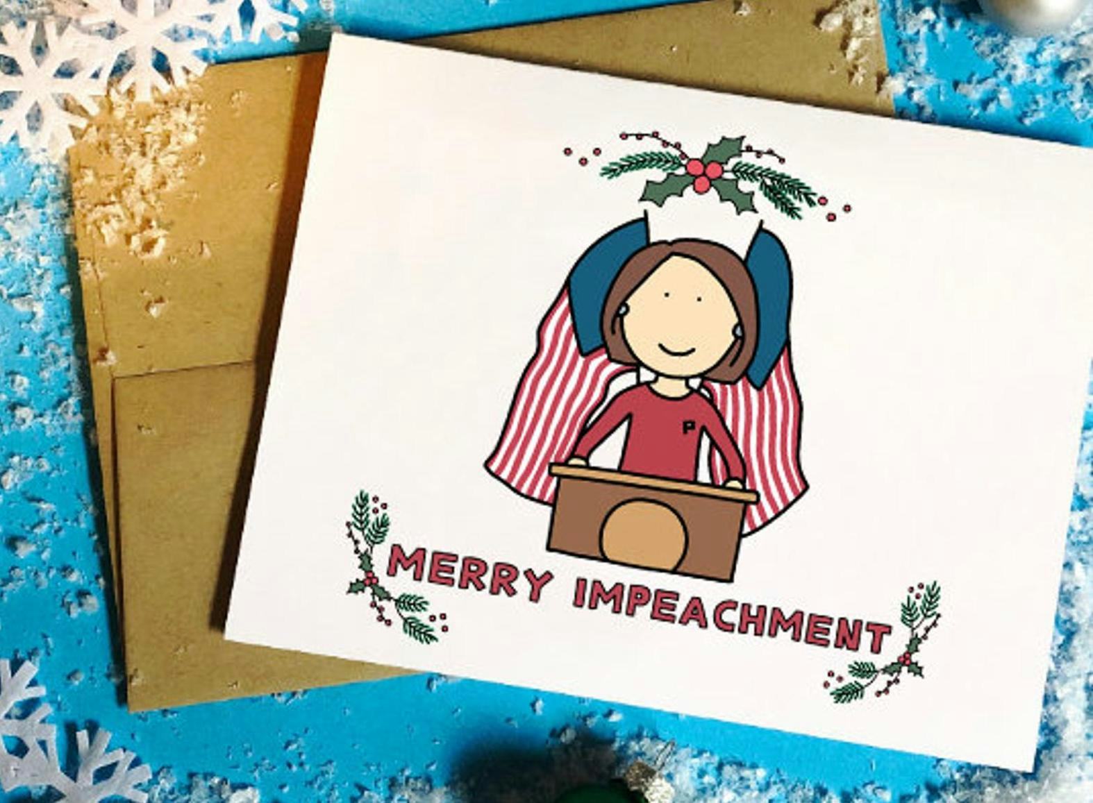 For anyone who would like to push their pro-impeachment message to an even more extended network — and/or those want to antagonize Trump supporters without having them to actually buy them a gift to wrap — fear not, you can choose from a wide selection of impeachment themed holiday cards. Here's one with a little wordplay from Zazzle, while a few intrepid Etsy creators have seized on the theme as well. Perhaps House Speaker Nancy Pelosi will be sending this one out?