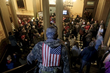 According to CNN, only 275 protesters — of an estimated 400-700 total — were allowed into the capitol building at a time. A police representative downplayed the rally to the network, explaining that the protesters were simply "chanting peacefully and that was it."