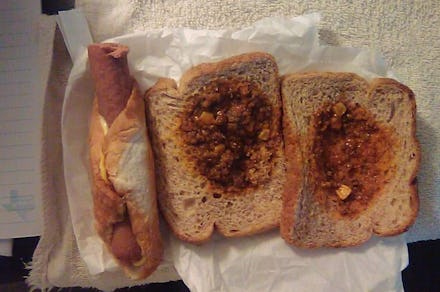 In theory, the johnnies include a breakfast which is typically boiled eggs, dry cereal, and raisins, while lunch and dinner are typically two sandwiches each — some combination of a chicken or beef patty, mystery meat, or peanut butter which prisoners report is sometimes watered down with cooking oil. It sounds like a reasonable (if unbalanced) amount of food — but it doesn’t really look like it in photos. “The johnny sacks are very bad,” Theodore “Cigo” Crews wrote in a letter to his daughter that she shared with The Marshall Project. Once, he said, “We only got a foam cup of BBQ chopped beef. That’s all.”