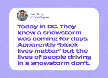 Okay, now go back and read that tweet again and then ask yourself what point a man who once explained away Trump’s noxious obsession with his own last name as simply honoring the fifth commandment is trying to make here. Is he accusing the District of Columbia of prioritizing the lives of social justice protesters over the lives of ... people driving in the snow? Where, exactly, does he make that connection? What sort of galaxy brain sees a few flakes come twinkling down in January and immediately gets just so dang furious at Black people?