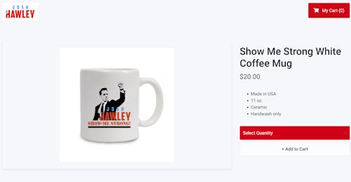 As The New York Times’s Jonathan Martin noted, the mugs seem to have first debuted at a Missouri GOP conference this past weekend — but according to The Kansas City Star, those mugs were emblazoned with a “made in China” sticker. The ones being sold through Hawley’s campaign email explicitly claim to be made in America.
