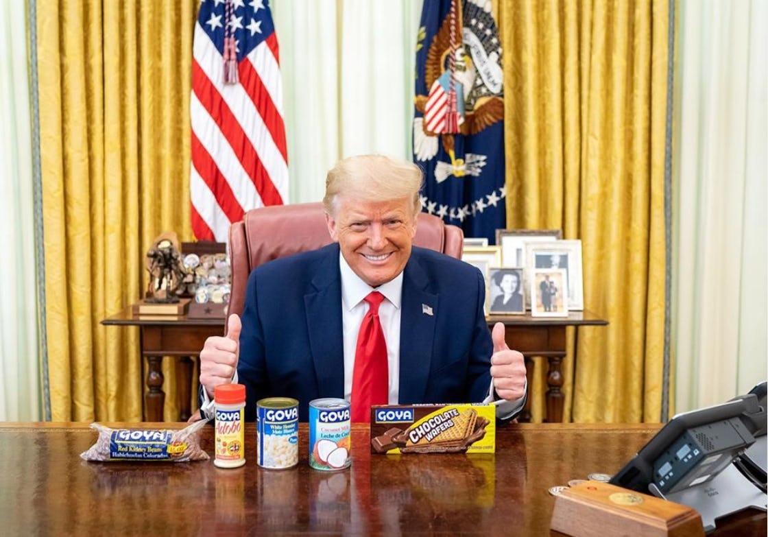Specifically, I'd like to talk about the array of Goya products — beans, other beans, delicious chocolate wafers, and the like — that President Trump posted on his Instagram page Wednesday, grinning behind them like some proud papa who can't wait to show the world his beautiful bean offspring.