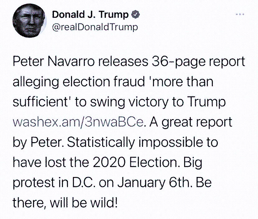 The tweet in question was fired off by Trump on Dec. 19, 2020. In it, Trump links to a report from his ally and deeply unserious person Peter Navarro that claims to reveal enough instances of voter fraud during the 2020 election to “swing victory to Trump” — which is not how anything works, but sure. (Navarro would later go on to explain how he and others in Trump’s circle actively planned to overturn the 2020 election.) “Statistically impossible to have lost the 2020 election,” Trump claims, before adding what would ultimately serve as the rallying cry for insurrectionists: “Big protest in D.C. on January 6th. Be there, will be wild!”