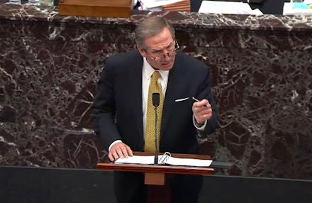 Trump's attorneys' argument, scattershot and deranged as it was, was essentially that the president can't be blamed for the coup attempt on Jan. 6 because he's actually made speeches where he's called himself pro-police, and besides, Democrats have urged people to "fight" against Trump and also coronavirus and also-also general oppression so why aren't THEY being prosecuted, huh? (That Democrats' extremely benign use of the word "fight" in campaign speeches and ads hasn't immediately preceded bloodshed at the nation's Capitol somehow didn't factor into the Trump team's case.)