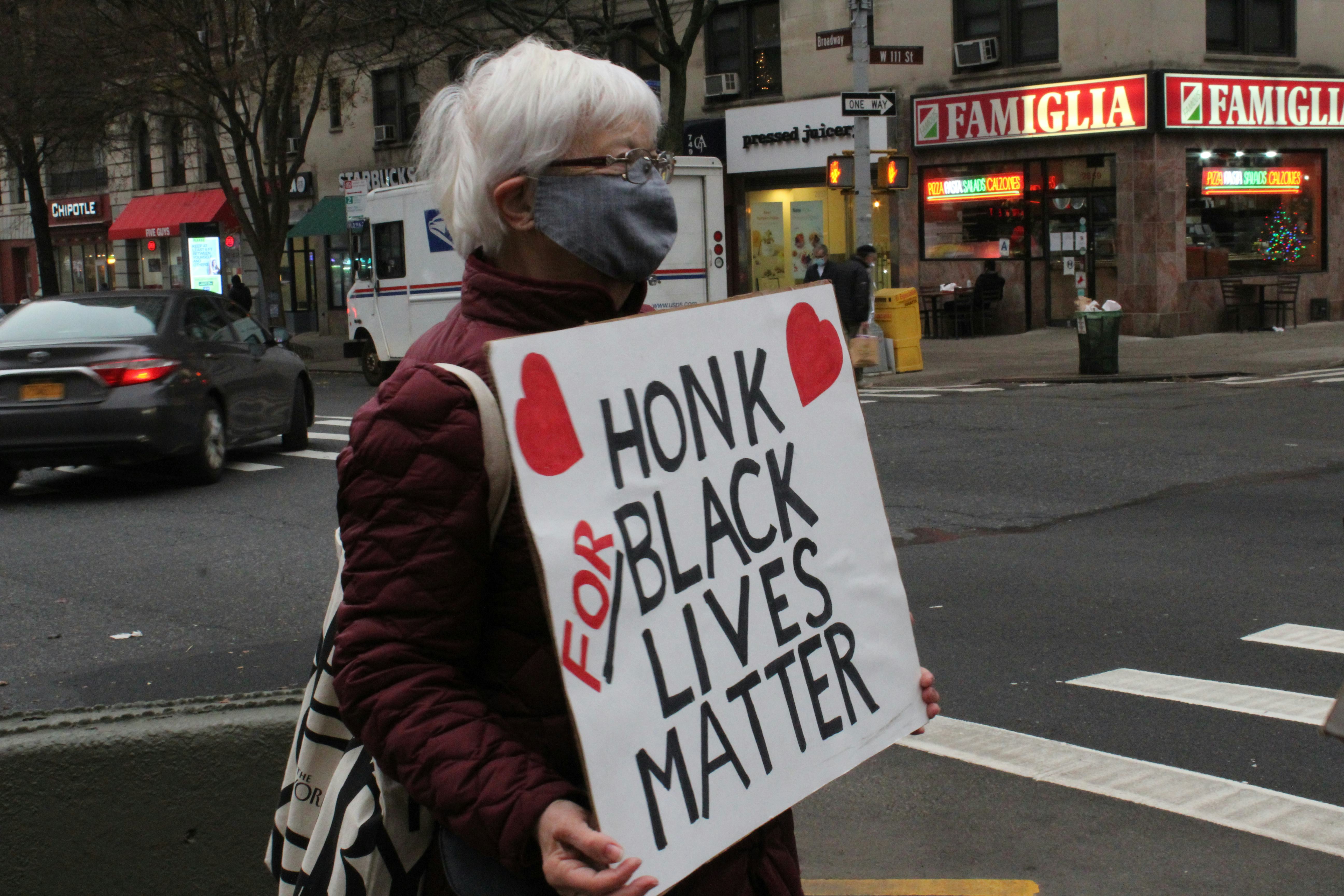 Each evening, as dusk falls on Manhattan’s Morningside Heights neighborhood, 78-year-old Sonia Jaffe Robbins leaves her apartment where she has isolated since the coronavirus pandemic began in March. She joins a small gathering at the intersection of Broadway and 111th Street, wearing a surgical mask and carrying a sign that lists the names of Black people killed by police. As traffic roars by on Broadway, drivers shout support out their windows, bicycle delivery workers raise their fists, and the bus offers a blaring honk.