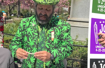 It’s my well-researched hypothesis that some of the smartest people in the world are also stoners. On this sunny, warm 4/20 in NYC’s Union Square, I got a little more proof. Tweets about two dudes handing out joints to people with completed vaccination cards immediately sparked my interest. I darted over to the park, wondering who these venerable, science-revering Stoner Santas were.