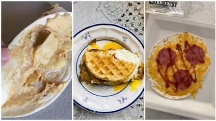 To infuse some lolz into this heavy time, I asked other people to share stories of their unhinged quarantine meals, too. Luckily for them, their pandemic brain fog yielded better results than mine did. Not unlike the cream cheese and hot Cheeto sandwich you whip up in a stoned daze, they might've seemed hilariously sad or somewhat questionable at first glance — but in they end, they turned out to be *chef’s kiss* pure genius.