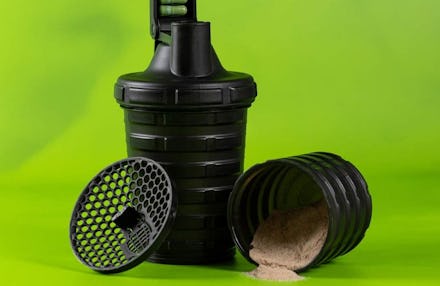 If you travel often or tend to hit the gym after work, you'll need something that's practical and strong enough for an on-the-go lifestyle. The Grenade Shaker Bottle has a unique handle that clips onto your bag, and it's made from sturdy, durable plastic that can stand up to the dishwasher, microwave, and freezer. There's a removable storage container that can hold up to two servings of protein powder, measurement markings along the side, and a flip-cap lid to hold up to four supplement capsules. Get it in army green, black, yellow, or gray.