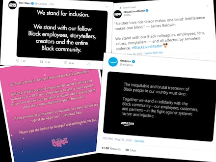 No company seemed to disqualify itself from the discourse, regardless of its history of compounding injustice. There were somber messages from Google, Amazon, Netflix, Bratz dolls, the bidet company Tushy, CBS, L'Oréal, and a copy-pasted message shared across the Disney, Star Wars, and Marvel accounts. With few exceptions, these posts follow similar non-specific verbiage: standing against racism, urging inclusion and unity, and sometimes actually typing out Black Lives Matter. Many of the entertainment industry posts stand in solidarity with “black colleagues, creators, partners, and audiences,” or in clearer terms: everyone who helps keep the lights on.