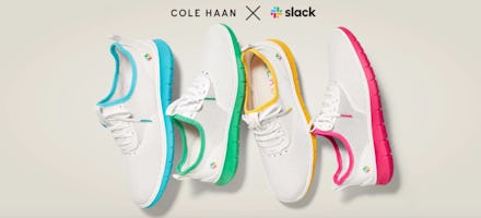 Due to the coronavirus pandemic, offices across the country are closed for the foreseeable future, forcing employees to work remotely. Now, Cole Haan has figured out a way to further blur the lines between work and home. The footwear company has teamed up with Slack to release a limited-edition collection of shoes, so you can dress like a tech bro in the comfort of your own crib. As if the messaging app wasn't taking over our lives already, it's now coming for our closets with basic bright white sneakers that are emblazoned with the Slack logo.