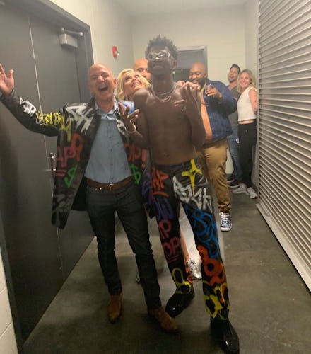 All of the photos are weird. Katy Perry's overly zealous pop energy isn't making the pictures less unsettling. The photos are only made more bizarre by everyone's outfits: Bezos is wearing a button-down tucked into jeans – giving real Dad at Whole Foods vibes. Katy Perry is wearing a neon pink and green zebra-striped dress, and her bleached blonde hair set in very stiff waves. She looks like she's from some John Hughes film about a prom night gone awry. And Lil Nas X? Well, he ditched the cowboy boots and hat and traded them in for a very 90s leather pant and jacket set, paired with a pair of glasses that serious rollerbladers might wear.