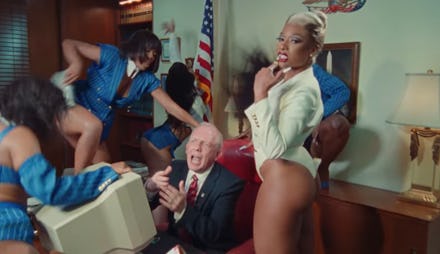 Praise the Hot Girl gods, because Tina Snow, aka Megan Thee Stallion, is back in business and wasting no time destroying her detractors — or at least pretending to in her latest music video. Meg’s new single “Thot Shit” dropped at midnight on Friday, and the video is giving us 9-to-5 revenge vibes. The Hot Girl Coach and an army of gorgeous co-conspirators terrorize a fictional conservative senator who gets off on trolling sex-positive women. Obviously, Meg is omnipotent and doesn’t put up with such disrespect, so the old white man gets what’s coming to him.