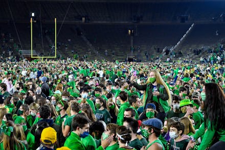 When colleges raced ahead with in-person schooling despite surging caseloads and early outbreaks, it became a question of who would shoulder the blame if COVID-19 spiraled further out of control. Notre Dame president Reverend John Jenkins — the same guy who attended the maskless White House superspreader party for Amy Coney Barrett — has taken to scolding his students for violating coronavirus guidelines. After Notre Dame football upset the No. 1 ranked Clemson Tigers on Saturday, students flooded onto the field in celebration. Even though most kids were wearing masks, they were still right on top of each other.
