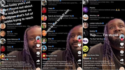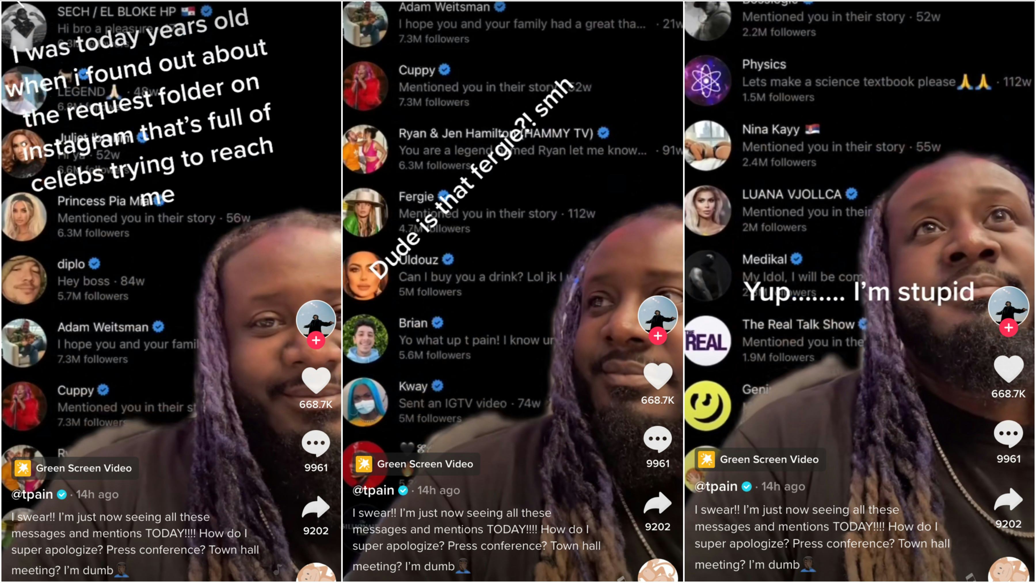 In an extremely relatable epiphany, the hip-hop/R&B hitmaker realized yesterday that the app has multiple inboxes, with a separate tab for message requests. "I was today years old when I found out about the request folder on Instagram that's full of celebs trying to reach me," T-Pain wrote on TikTok. "I’ve been accidentally straight up ignoring all these people for like two years," T-Pain said, shaking his head at the deluge of DMs from verified accounts.