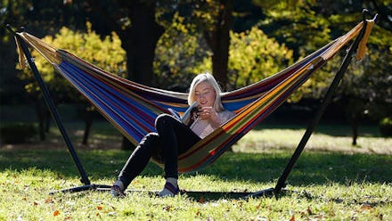 If you prefer the hassle-free design of a freestanding hammock, this enormously popular Vivere cotton hammock is a solid choice. With nearly 10,000 reviews on Amazon, it has a sturdy stand that's built with robust stainless steel legs to offer stability. The ropes at each end are woven with tough polyester, and the adjustable hooks allow you to customize the length. Plus, the soft fabric comes in your choice of cotton, mesh, or polyester, all of which are breathable and durable. This hammock is big enough to fit two people and comes with a convenient carrying bag. What's more, it's available in almost 40 colors.
