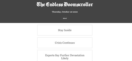My best hypotheses are similar. As Grosser alluded to, the Endless Doomscroller strips away content that could lead to a spiral of reading increasingly worse things. On Twitter, for example, a tweet sharing bad news can be a portal to a wall of replies full of bigotry or coronavirus denialism. Grosser’s project at least takes away that additional stressor.