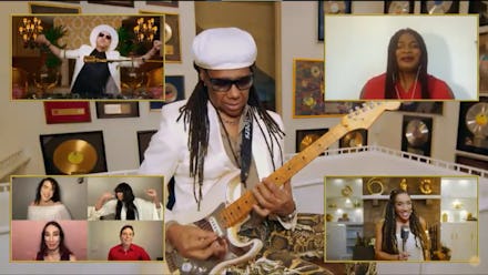 Although I’m not the target audience for feel-good webcam performances, my soul only started to leave its body when someone named DJ Cassidy tried to slot his cheery ad-libs into Nile Rodgers and Kathy Sledge’s remote take on “We Are Family.” Rodgers, strumming away in front of his walls of gold records, appeared to be similarly over-it.