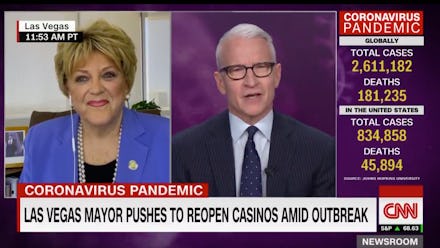 Given that fact, you would think that Las Vegas Mayor Carolyn Goodman would be taking her role presiding over the state's pandemic epicenter with a little more seriousness than she displayed during a truly wild taping of CNN's Anderson Cooper 360º with its eponymous host. During the interview, Goodman said she's in favor of reopening businesses in her city, even though she doesn't have an actual plan for how that could be done safely. In essence, she described a coronavirus outlook that resembles a Hunger Games-style fight for survival among businesses wracked with disease.