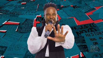 Finally, at the close of the convention’s first night, Billy Porter teamed up with Stephen Stills of Buffalo Springfield to sing the band’s iconic protest song, “For What It’s Worth.” Legend has it, Stills wrote the song in 15 minutes, reacting to images of police brutality against teenagers on LA’s Sunset Strip in the 1960s. The DNC revived the track as a green screen performance, with Porter caped and traipsing and Stills shredding his guitar against a background of a deconstructed American flag and images from protests against police brutality this summer.