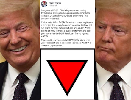 This time, it came in the form of a Facebook ad put out by the president's "Team Trump" re-election page, which encouraged recipients to "add your name IMMEDIATELY to stand with your president and his decision to declare antifa a terrorist organization." Without explanation, the ad also featured the image of an inverted red triangle.