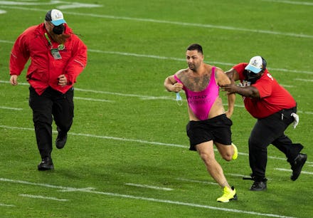 As Vulture points out, the would-be streaker wasn’t doing it for the love of the game, but to shill for the porn site Vitaly Uncensored. (This is the same porn site that sent an Instagram model to run on the field back in 2020’s Super Bowl — so a two-year streak of this stuff.) The guy’s pink unitard thong getup, which kept almost everything in his pants, had Vitaly Uncensored written across the front. Points docked for not doing a real streaking — basically Borat maskini levels of exposure — and for just falling short of the end zone.