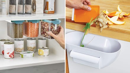Make the most of your cupboard space with these under-shelf food storage containers that are great for cereal, pasta, and other dry goods. The adhesive storage rail can be mounted inside or underneath your cabinets with no tools required, and the set includes three 1.3-quart airtight containers with easy-pull tabs, so you can slide each one out when you need it.