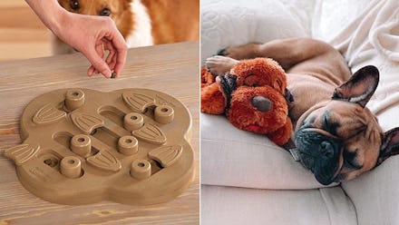 This heavy-duty dog lick mat promotes licking in a way that’s easy for you to clean. “A well-behaved dog is one who is always occupied with something to do. [...],” Simon says. “Food puzzles are perfect for when you are both relaxing in the evenings and can keep your dog settled for hours.” Add spreadable treats like yogurt, peanut butter, or mashed banana on the pads to keep them occupied and happy. It can also be a great way to feed dogs who may eat too quickly.