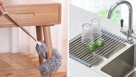 “Keep the kitchen clean by doing the dishes as soon as you finish eating [and] wiping down counters and appliances regularly,” advises Kropovinsky. Tools like this roll-up dish drying rack make it easy to wash glasses and dishes as you use them and keep the counters free of clutter.