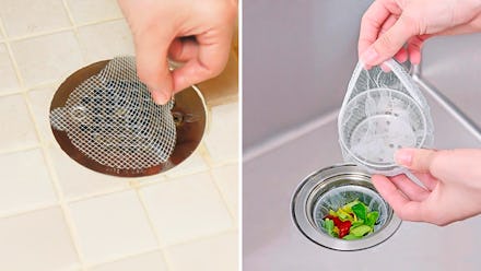 Fix: Strainer bags that make tossing food scraps easyLetting food scraps go down your kitchen drain is an easy way to wind up with clogged pipes. Enter: these mesh bags. They stretch to fit around your drain strainer, preventing any little bits of debris from clogging up your pipes. The best part? Once the bag is full, simply toss it into the trash and replace it with a new one — no need to clean it out.