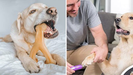 Reach for this squeaky toy when your pup refuses to sit still on teeth-brushing day because it has the perfect ridgy spot to hide a little bit of toothpaste and help scrub teeth while they chew. If it’s not doggie dental day, this seriously durable natural rubber toy also works with peanut butter or all on its own as a stress reliever.