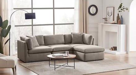Not only is this modular sofa high quality — featuring stain-resistant fabric, reversible seat and back cushions, and a self-close hidden storage compartment in the ottoman — it’s also a great value that gives you options. The four pieces can be arranged to fit your needs, but can also be changed down the line if desired (no tools necessary). The sofa comes in gray, linen, tan, and navy. Two accent pillows are also included.