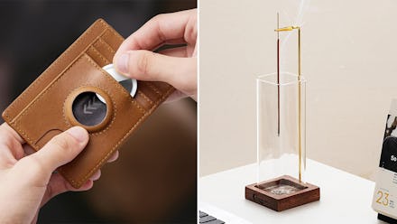 This incense holder has an innovative upside-down design and a built-in ash catcher to keep surfaces clean. It consists of a wood base, a glass cylinder, and a firm brass incense holder for a cool mixed material look. The budget-friendly set also includes 20 incense sticks and a handy ash brush.